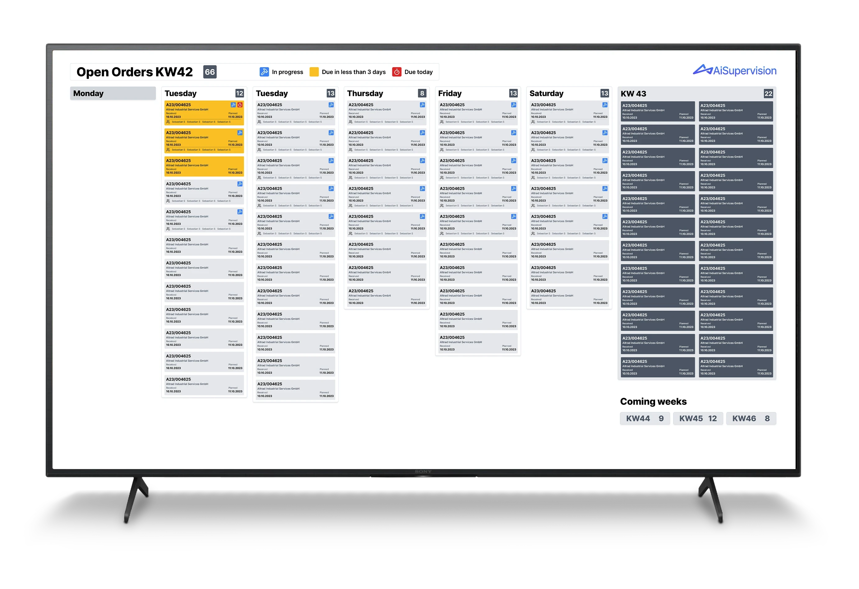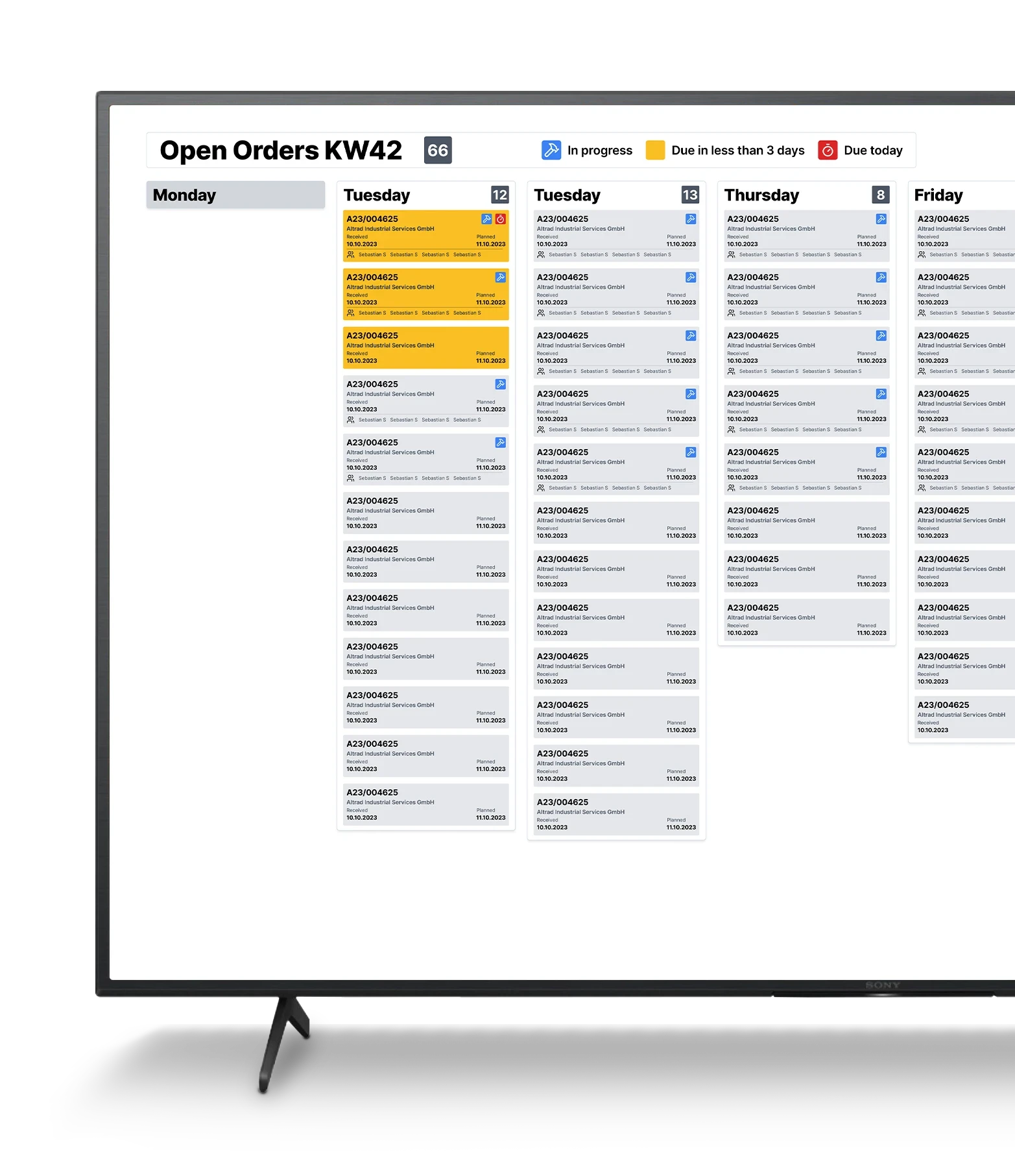 Allowing floor managers to quickly grasp the order situation for the current week with a condensed view of the coming weeks. Orders can be set up with the variables important a variety of situations. In this case, size of an order can be understood by the amount of workers tagged on the card.